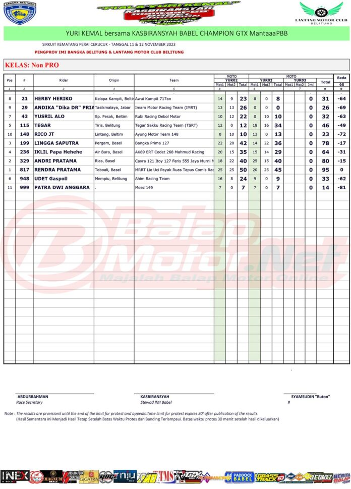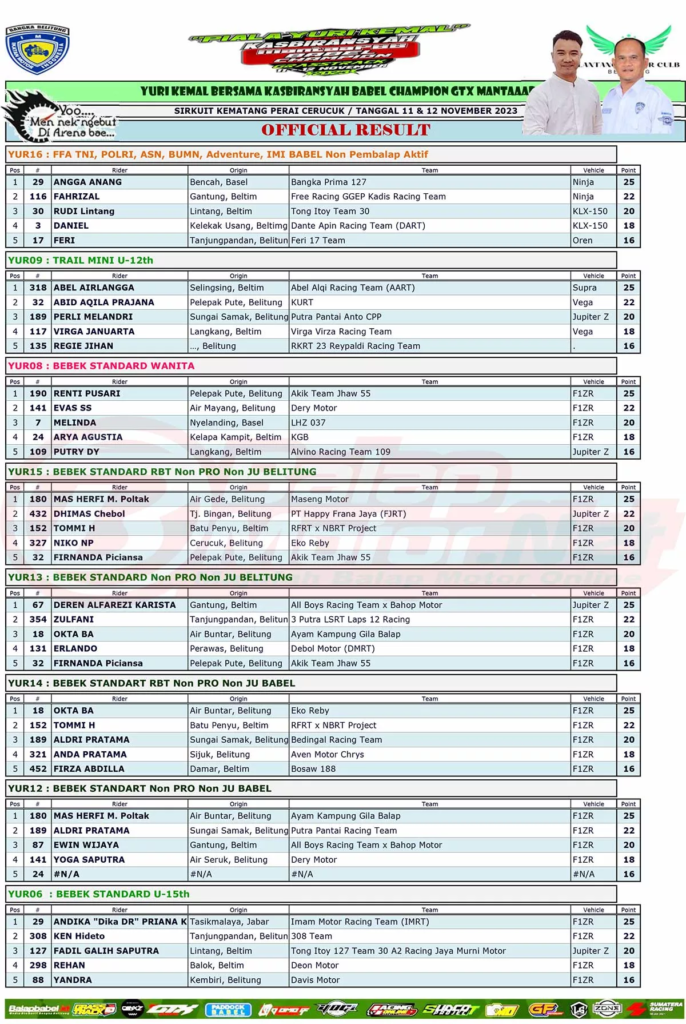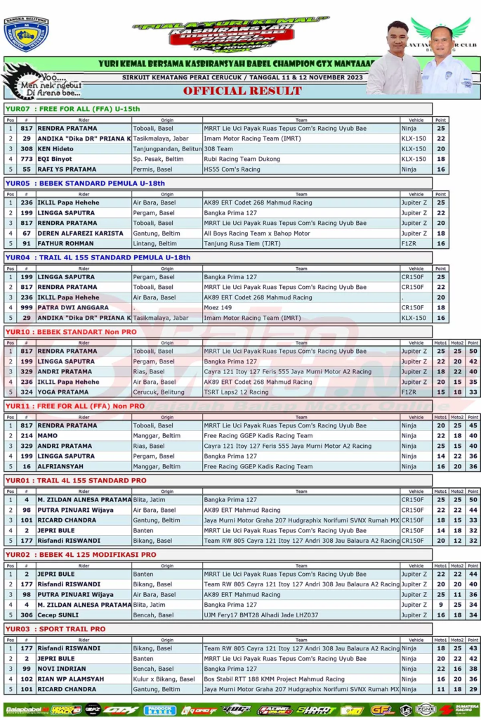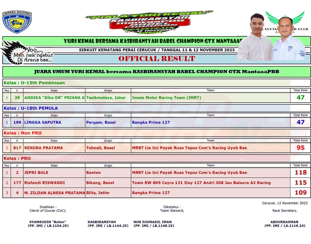 Berikut merupakan hasil juara dari gelaran Yuri Kemal Bersama Kasbiransyah Babel Champion GTX MANTAAPBB yang digelar di sirkuit Kematang Perai Cerucuk, Belitung pada 11-12 November 2023.